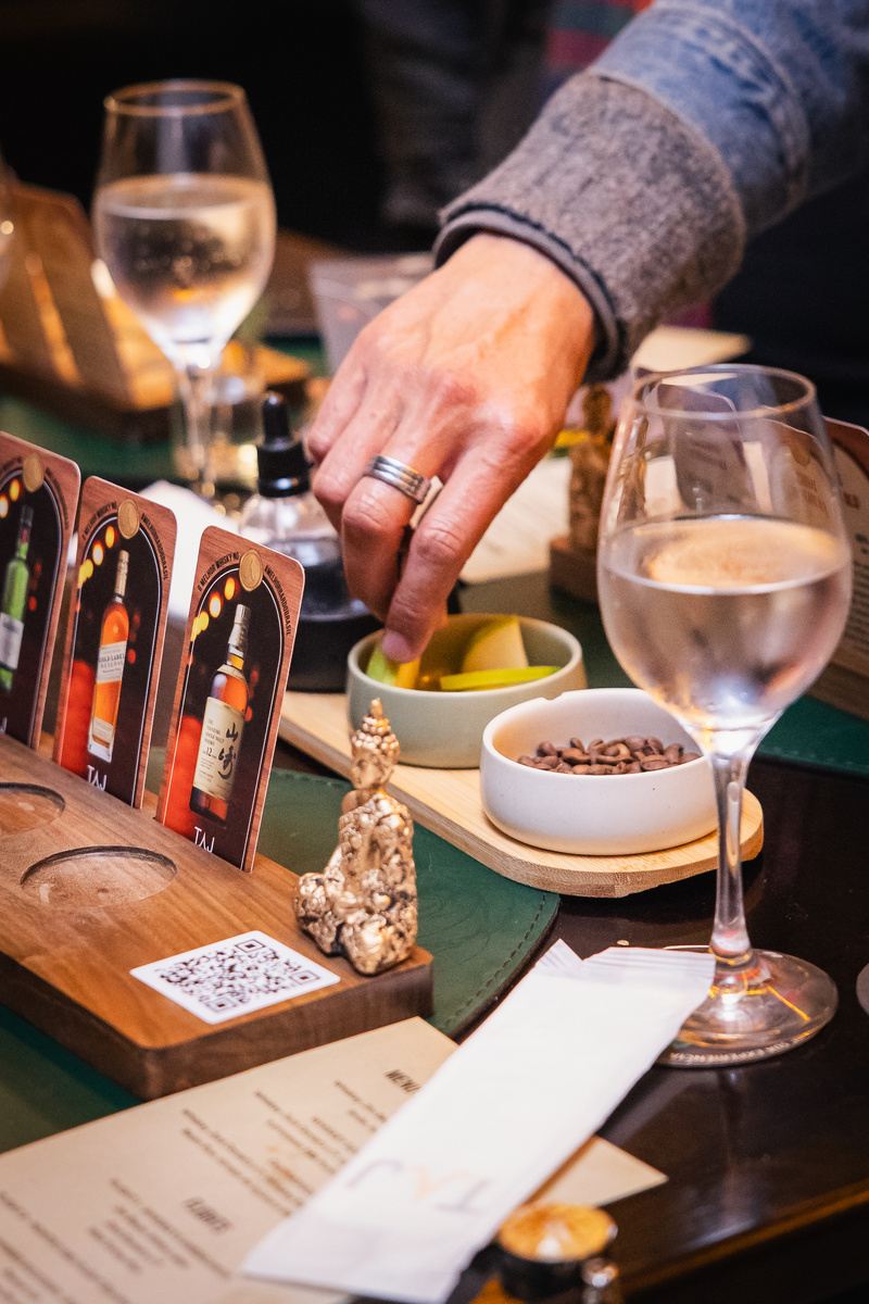 Como o bar tem dimensão e ocupação grandes, a experiência de degustação foi pensada para que o consumidor possa se auto guiar com os whiskys escolhidos. Ao pedir uma régua com três copos, chegam à mesa, além do card com a imagem da garrafa e as informações sobre o rótulo escolhido, um kit com conta-gotas de água (para testar o whisky com leve diluição), lâminas de maçã verde e biscoito (para limpar o palato) e grãos de café (para o olfato).