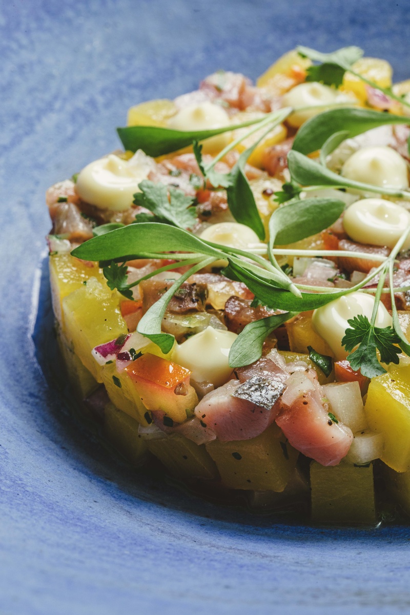 Peixe defumado com mandioquinha, erva-doce e maionese