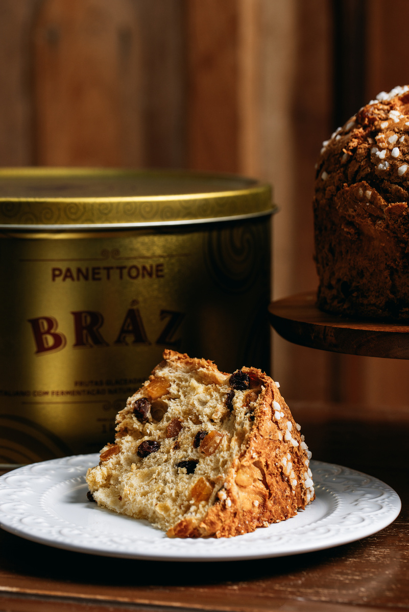 Além de vir acondicionado em uma bela lata, o panettone de frutas da Bráz Trattoria se destaca pelo método de produção, que segue um decreto lei italiano de 2005, segundo o qual são estabelecidas normas para a massa – deve ser de fermentação natural, por exemplo – e para o uso de determinados ingredientes, como ovos de galinha classe A e manteiga extra. Como resultado, o panettone apresenta um miolo aerado, um tanto úmido e adocicado, enriquecido com uva-passa, cidra e laranja bahia glaceadas. A unidade custa R$ 209, tem 1 quilo e pode ser adquirida nas unidades da Bráz Trtattoria, da Bráz Pizzaria e nos canais de e-commerce da rede.